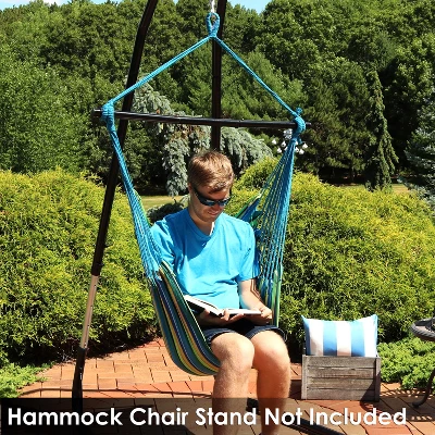 Relax and unwind by resting in this comfortable hanging hammock swing chair on the patio, deck, garden, or other living space featuring blue, green, and tan stripes. The durable 65% cotton and 35% polyester cover with polyurethane foam filling seat provides comfort and support while the material remains resistant to the elements outdoors. Take your hammock swing chair anywhere you’d like easily with the foldable spreader bar and convenient carrying case. The bar folds into three pieces to ensure easy transport and storage so you can enjoy this chair in any park or campsite. Hang this hammock swing chair outdoors to enjoy some relaxation after a long day or hang this hammock chair indoors on any ceiling hook for a fun indoor sitting space. A quick set up allows you to spend time with loved ones outside or enjoy some quiet reading time. No matter where you hang it, this hammock swinging chair allows you to relax comfortably. Please note, a stand is not included with purchase.