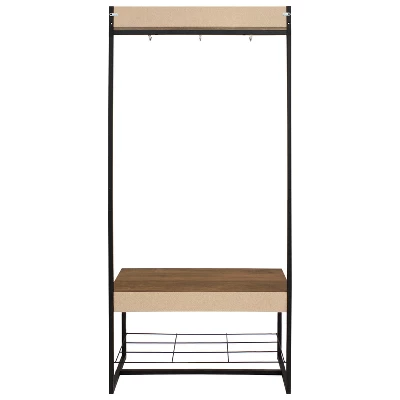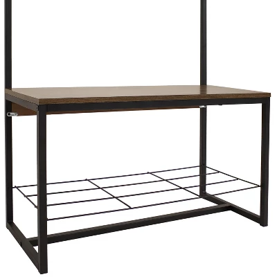 Organize the entryway with this sophisticated hall tree bench featuring a coat and shoe rack. This convenient entryway bench with hooks is great for containing clutter and storing coats, shoes, backpacks, purses, and more! Featuring a shelf and bench seat made from scratch- and stain-resistant, medium-density particleboard (MDP) and a powder-coated steel frame, this modern entryway coat rack bench has a distinct, industrial-style look that will complement any decor style. Plus, it has four protective PVC feet to help prevent floor scratches and scrapes. This hall tree features three hooks for hanging coats, scarves, or purses and bags as well as a lower shoe rack that can store up to four pairs. The bench and upper shelf also provide convenient surfaces where you can keep lunchboxes, hats, and gloves. It can even be used to display houseplants or picture frames. It’s a convenient addition to the entryway, utility room, or mudroom.
