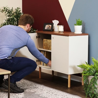 Keep everyday essentials close by in this mid-century modern accent cabinet. Place the cabinet in the living room, entryway, dining room, bedroom, or bathroom for a convenient and stylish storage option. The accent cabinet is made from medium-density particleboard with eucalyptus wood legs and aluminum hardware and is designed to be used in indoor spaces only. The buffet cabinet features two doors and a fixed 34″ W x 12.5″ D shelf. The doors keep anything inside the cabinet concealed while the shelf allows you to maximize the space with ease. This mid-century cabinet requires full assembly before use, but the included step-by-step instructions help make assembling it easy.