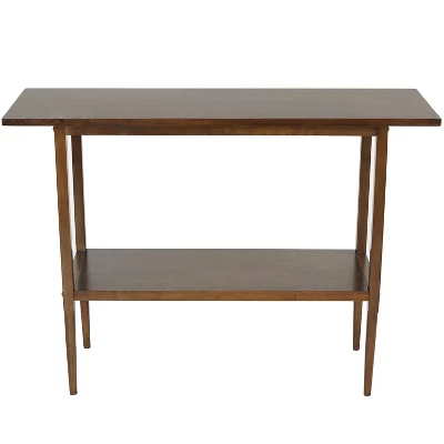 Add a stylish place to display small potted plants, pictures in frames, knickknacks, and other decor pieces indoors on this wooden living room console table. Designed to accent any indoor space, this console table can be placed behind a sofa in the living room, along a wall in the dining room, against a wall in the home office, or even against a wall in the bedroom. This hallway entry table features a smooth top and shelf for displaying multiple decorations or keeping everyday necessities nearby. The tabletop and shelf can each support up to 100 lbs, ensuring any decorations are displayed effortlessly. Made from solid rubberwood, this sofa table is finished with a dark walnut stain to complement many indoor decor styles. Assembling this console table is simple with the included step-by-step instructions. All hardware required for assembly is included with this table, however, no tools are included.