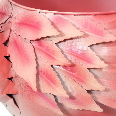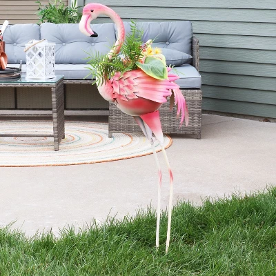 This outdoor metal pink flamingo statue will add a pop of color to any modern, contemporary, or colorful outdoor or indoor aesthetic. Easy to assemble, the flamingo statue comes in 2 pieces that get connected via a thumbscrew and easily come apart for storage. All hardware and necessary materials are included to make your life easier! Just follow the instructions, place in your yard, patio, sunroom, garden, by the pool, or gracefully standing next to the pond, and watch your space transform with color and beauty with metal pink flamingo statue. This flamingo also comes with two metal stakes to ensure stability when placed in the yard or other soft surface. Featuring iron sheeting with a powder-coated finish and vibrantly painted topcoat, the outdoor yard art piece is sure to accent any garden as a fun, colorful feature. Plus, easily display your greenery with style: this flamingo features a built-in flowerpot to showcase your favorite ferns, lilies, roses, or any other herb, plant, or flowers.