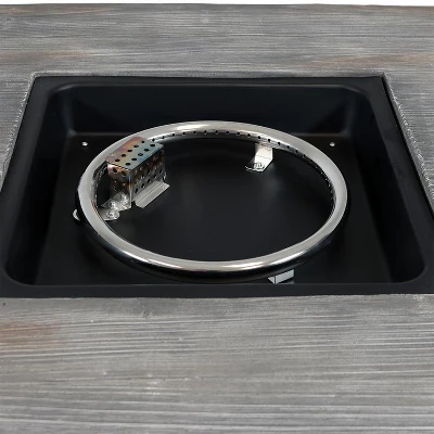 - Square propane gas-powered fire pit table with lava rocks.
