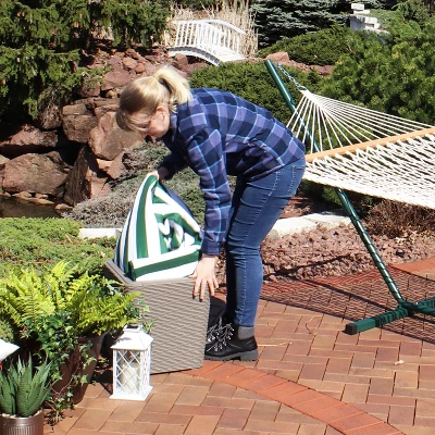 Add storage and style to the deck or patio with this multi-functional side table. The storage box features a UV-protected and weather-resistant polypropylene and resin construction with a rattan design that is sure to complement any outdoor living space while remaining resistant to the elements outdoors. This storage box features faux wicker that is smooth to the touch and won’t crack or break. This storage box is the perfect height to use as a side table next to any patio or poolside furniture for easy storage of pool toys and pillows while being able to set down your cool drink on top. The side table with storage is easy to assemble and designed to protect and store pillows, pool accessories, outdoor tools, and decor as well as other items. Stow away seasonal decorations, toys from the pool without worrying about water damage to the box, or other tools and items you want to have on hand.