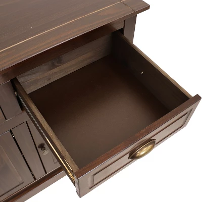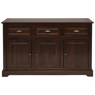 Whether you want to store kitchen supplies or need a convenient surface for serving snacks and drinks, this elegant sideboard cabinet is a stylish addition to any room. Made of solid pine, this classic furniture piece features a dark brown color scheme. Its retro drawer pulls and molding will complement a variety of decor styles and furniture pieces. The drawer pulls, doorknobs, and hinges are made from zinc alloy. It features three drawers with steel drawer slides for smooth opening and closing and three cabinets for an abundance of storage space. Plus, the cabinets feature an adjustable, built-in storage shelf for even more organization opportunities. This versatile piece can be used in your kitchen or dining room to store silverware, flatware, or pots and pans, or you can place this cupboard in the utility room to store cleaning supplies, craft supplies, hand tools, and other knickknacks.